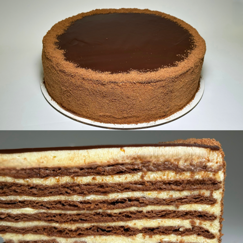 Опис: Тонкі шоколадно-медові коржі, ніжний вершкового заварний крем зовні прикрашений шоколадною помадкою та крихтою бісквіта.