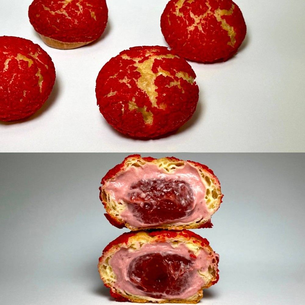 Опис: Тістечко Шу - це ніжне заварне тістечко з повітряною текстурою, всередині якого ховається ягідна насолода. Соковита полуниця в кремі надає десерту яскравої свіжості, а золотиста скоринка тістечка додає йому вишуканої ніжності.